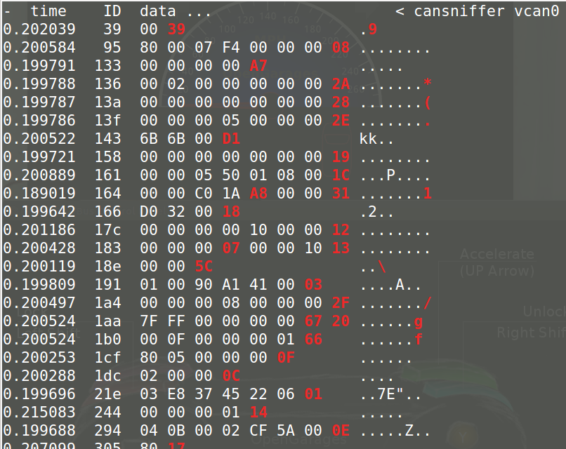 So thats cool, but what about actually understanding what is going on with this traffic, CanDump is not very useful for this, is scrolls by to quickly for us to learn much from. Instead we can use CanSniffer with colorized output to show us the bytes within packets that change. Below is an example of CanSniffer Traffic: